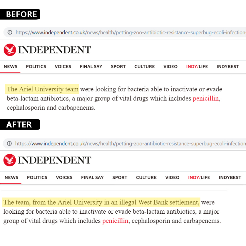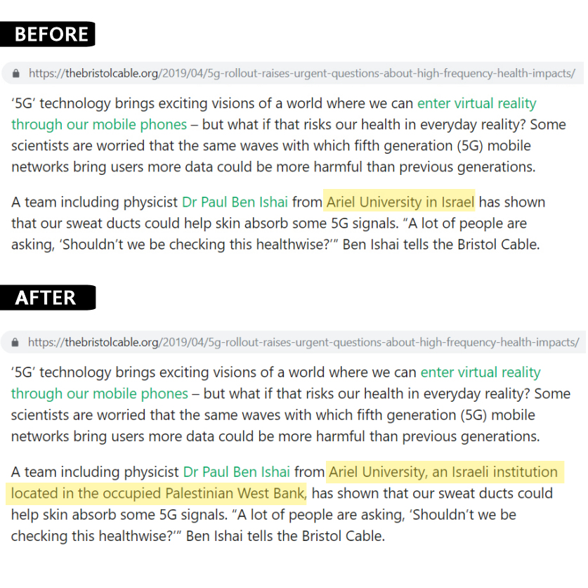Multiple media outlets have corrected articles that included false claims of Ariel University being located in Israel. Ariel University is instead located in an illegal Israeli settlement built on occupied Palestinian land in violation of international law.