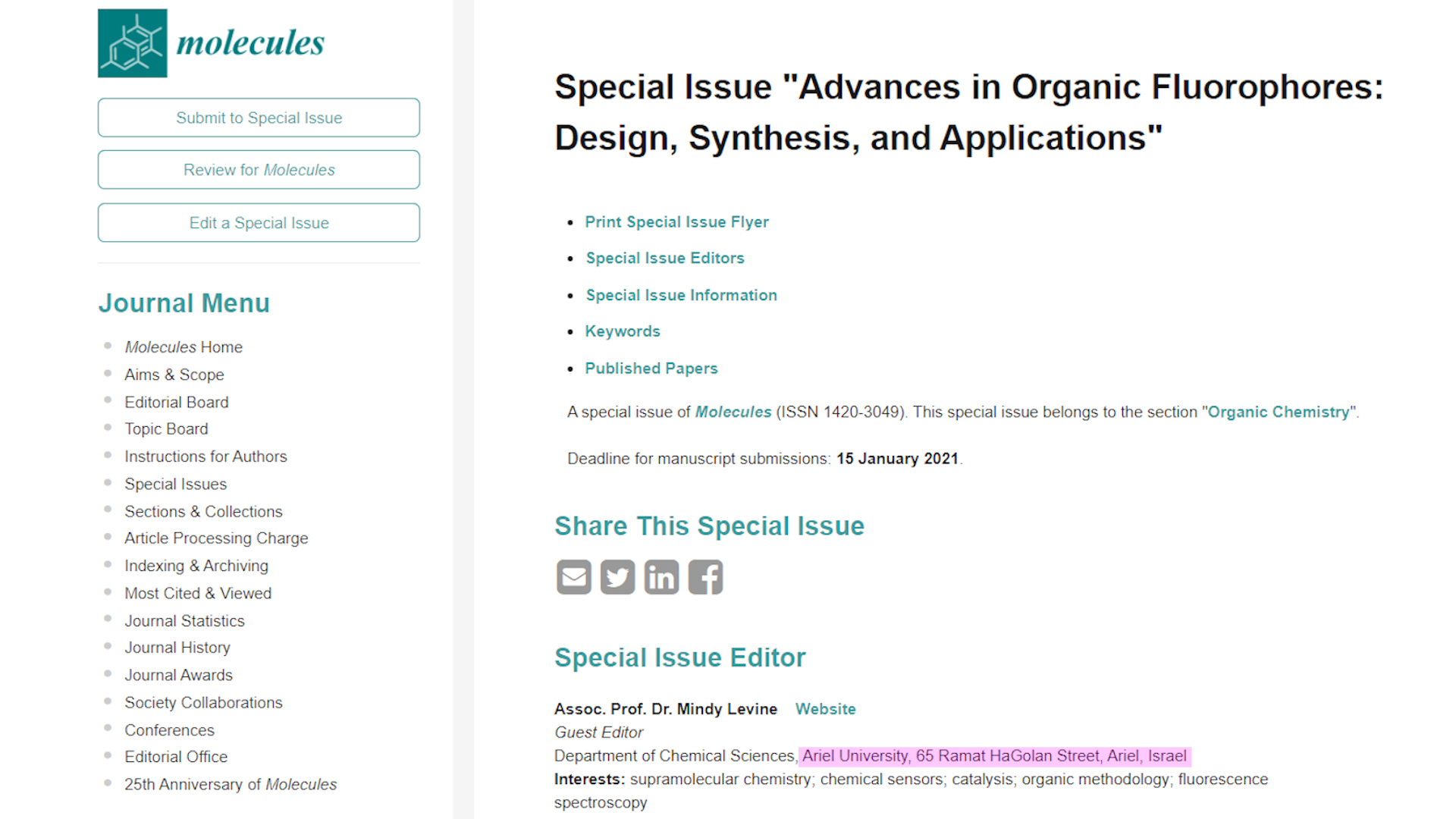 Molecules recently announced a special issue with a guest editor from Ariel University, whose affiliation was falsely listed as “Ariel University, 65 Ramat HaGolan Street, Ariel, Israel.”
