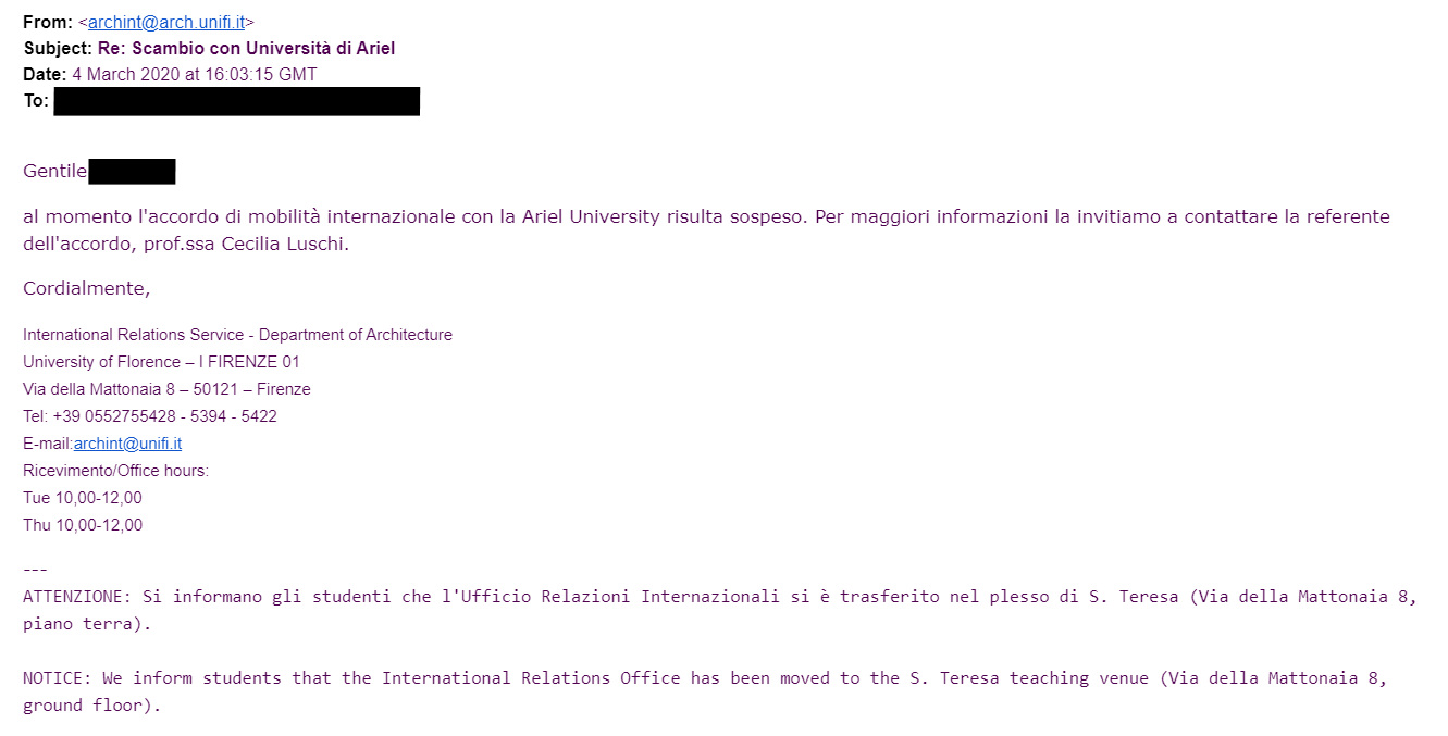 The University of Florence has ended an international mobility agreement with Ariel University. Last year, the university responded to academics in Italy saying that “international mobility agreement with Ariel University has been suspended”. In a February 2021 email, the university confirmed that “Ariel University was not included in the Call for Extra-EU Mobility for 20/21”.